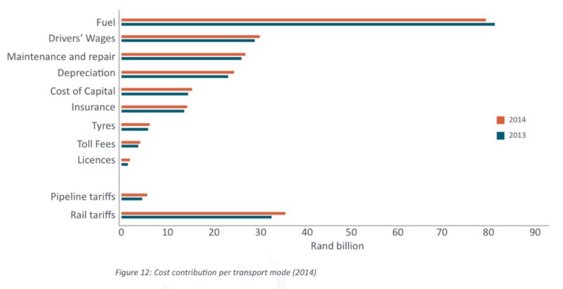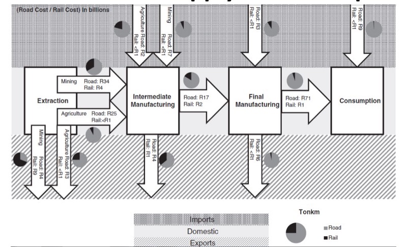 In the broader macroeconomic context, the key issues related to transport tend to be measured through logistics costs. One of the most consistent reporting tools have been provided by a cost model from Jan Havenga. Initially this was thorough the ‘State of Logistics Survey’; today the most recent publication is titled the Logistics Barometer. As a point of departure form a costing perspective is through these reports.