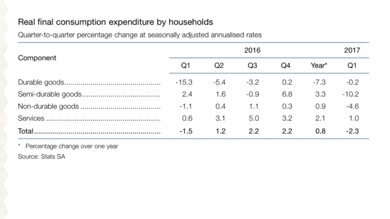 While in the secondary sector, largely manufacturing is contracting (-3.4) in Q1 2017,compared to 0.6% growth in Q1 2016. Tertiary and non-primary sector activity are the key (sudden) sources of contraction -2% and -2.3%, respectively. Such contractions are reinforced by higher inventories and lower sales at wholesale level particularly due to contracting consumer expenditure. In particular, real expenditure for households is contracting across all goods and services — red flagging the secondary and tertiary sector contractions. These are domestic issues, and transport and logistics costs are a crucial link between all sectors and services throughout the domestic production and consumption chain.