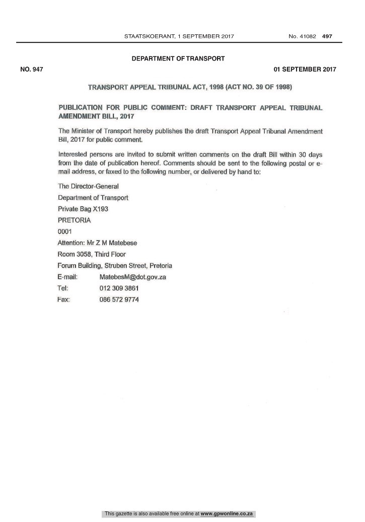 Call for comments: Transport Appeal Tribunal Act— by 1 October