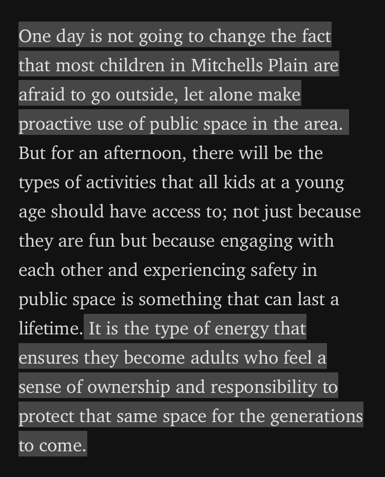 In the article Marcela Guerrero Casas argues that building a common unity is woven one street at a time. Her reflection on OpenStreets Mitchells Plain is rather startling but only a remind of the interconnected dynamics of making places. Her case is that freedom of movement is essential to living freely. There’s a lot of evidence that reveals how spatial cognition is a mental skill children develop the more they are in contact with space–navigating through it (have a look at Mac Mashiri and colleagues on this topic). Our brains are wired in such a way that changing our route in our daily morning commutes, walks or other trips can actually tap into different synaptic connections. Referred to as the bubble-wrap generation (read on this in one of Karen Lucas’ reports), those children growing up in completely isolated car oriented commutes–seldom absorbing space, seldom confronting people. What happens when one day the park is open for everyone? What happens when once a month the street is open for us to meet and explore safely? What happens when this becomes regular everyday life? Articulated rather intriguingly Marcela refers to a multigenerational sense of ownership– I’m thinking about it as a permanent sense of self.