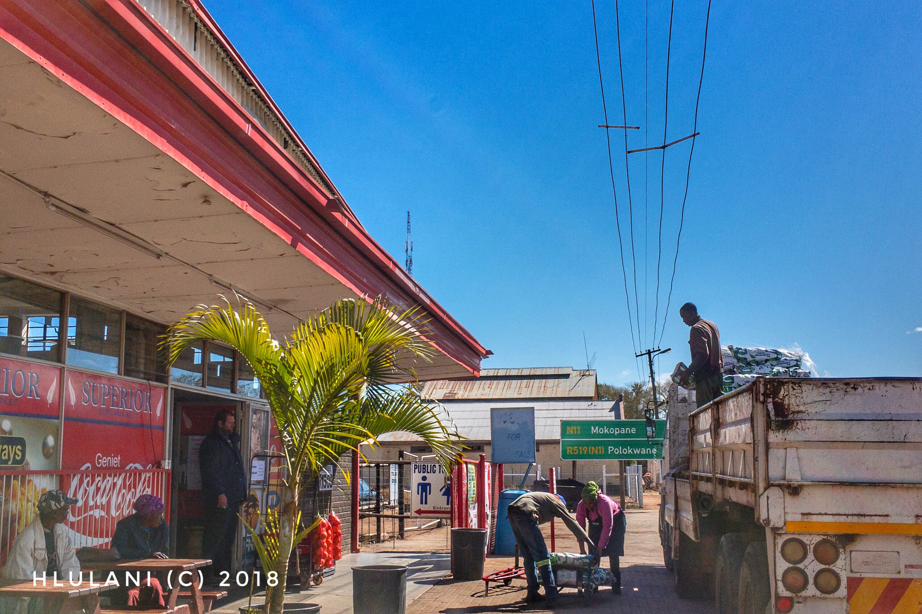 ROEDTAN— Faced with a missing branchline and massive cargo movement, this small town hosts a long history for being a key stopping point for long distance trips to communities south of Lebowakgomo. In this image, the town’s logistics take a unique tone. The woman who makes the great crispy chips, is working with the two men who’ve delivered baskets of potatoes. As the shop owner looks on, green signs of distant places reflect the hot sun for a winter morning.