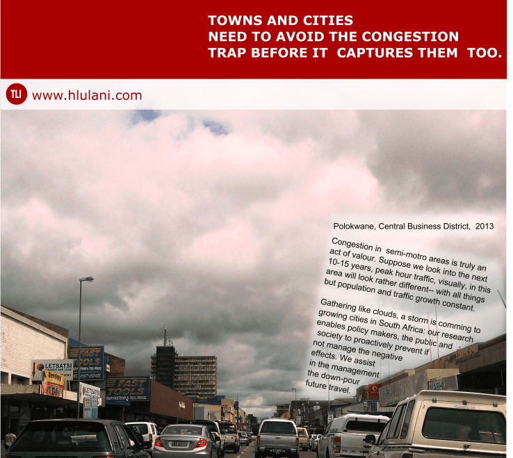 The City of Polokwane is one of my favorite thought places in SA. One reason is because it is and has been a key interface between urban and rural fabrics– hyper-wealth and agrarian societies. It is also a difficult place to face, because it serves as the primary shopping and to some degree recreation opportunities within 80km or so. Limpopo as a province is confronted with some of the lowest income households, and massive degrees of underutilized infrastructure and development opportunities. Anyway, in 2013, in the first company I was part of, one of the first places I reflected on was Polokwane. It’s growth was so fast, sprawling, evolving and reflecting new business, new wealth, and massive opportunities for public and non-motorized transport. While Polokwane gears up for the next Integrated Transport Plan, it is also confronted with the Bus Rapid Transit scheme as an opportunity too. We must prevent traffic congestion in our towns and cities, while encouraging significant investment in rail transport and air transportation. (I’ll talk about Polokwane’s Train Station and Airport on separate occasions). This photo, is an early note in which a broad expectation is that the peak traffic may be longer, and tougher to get out of where ever we live, love and build.