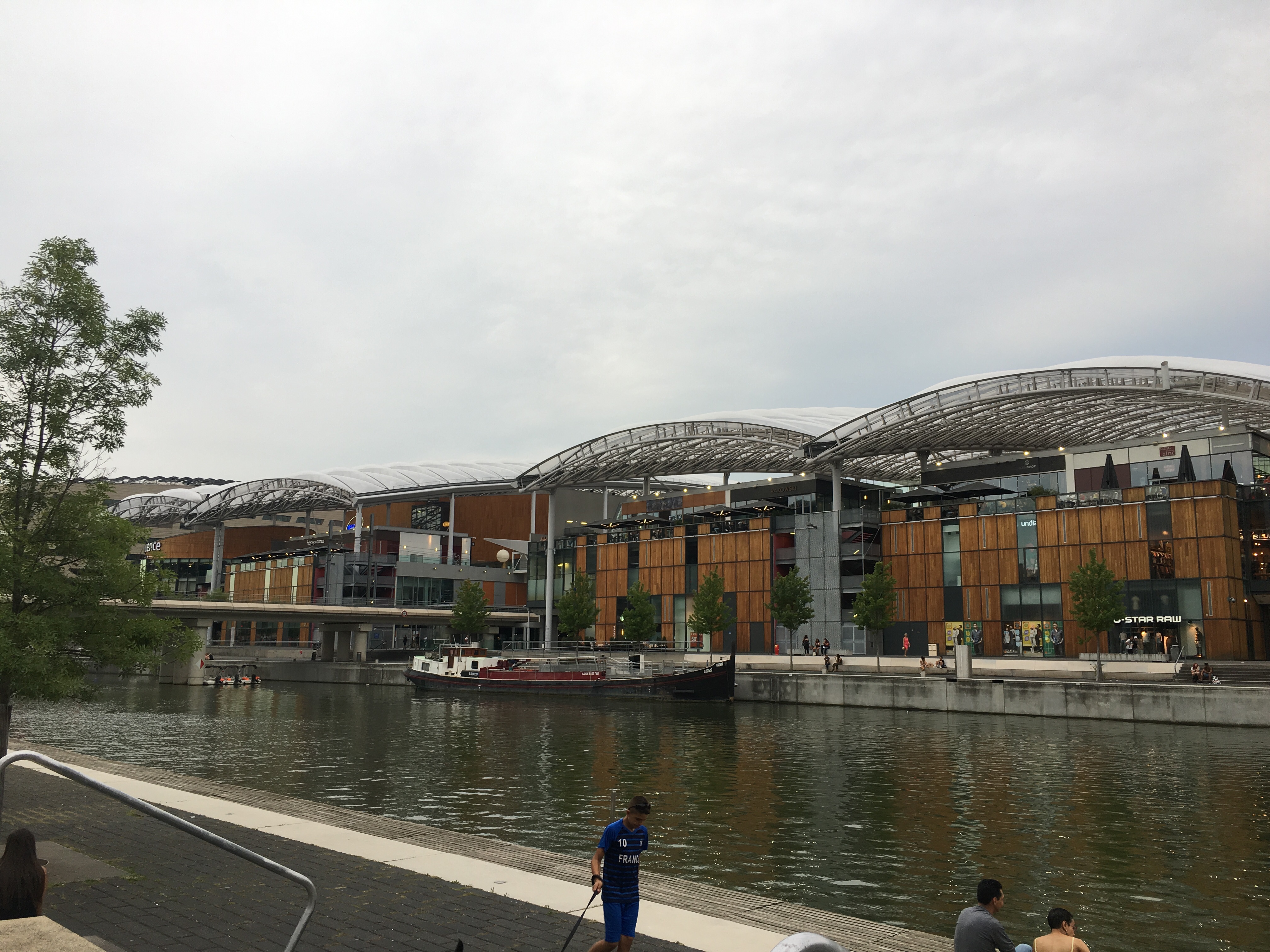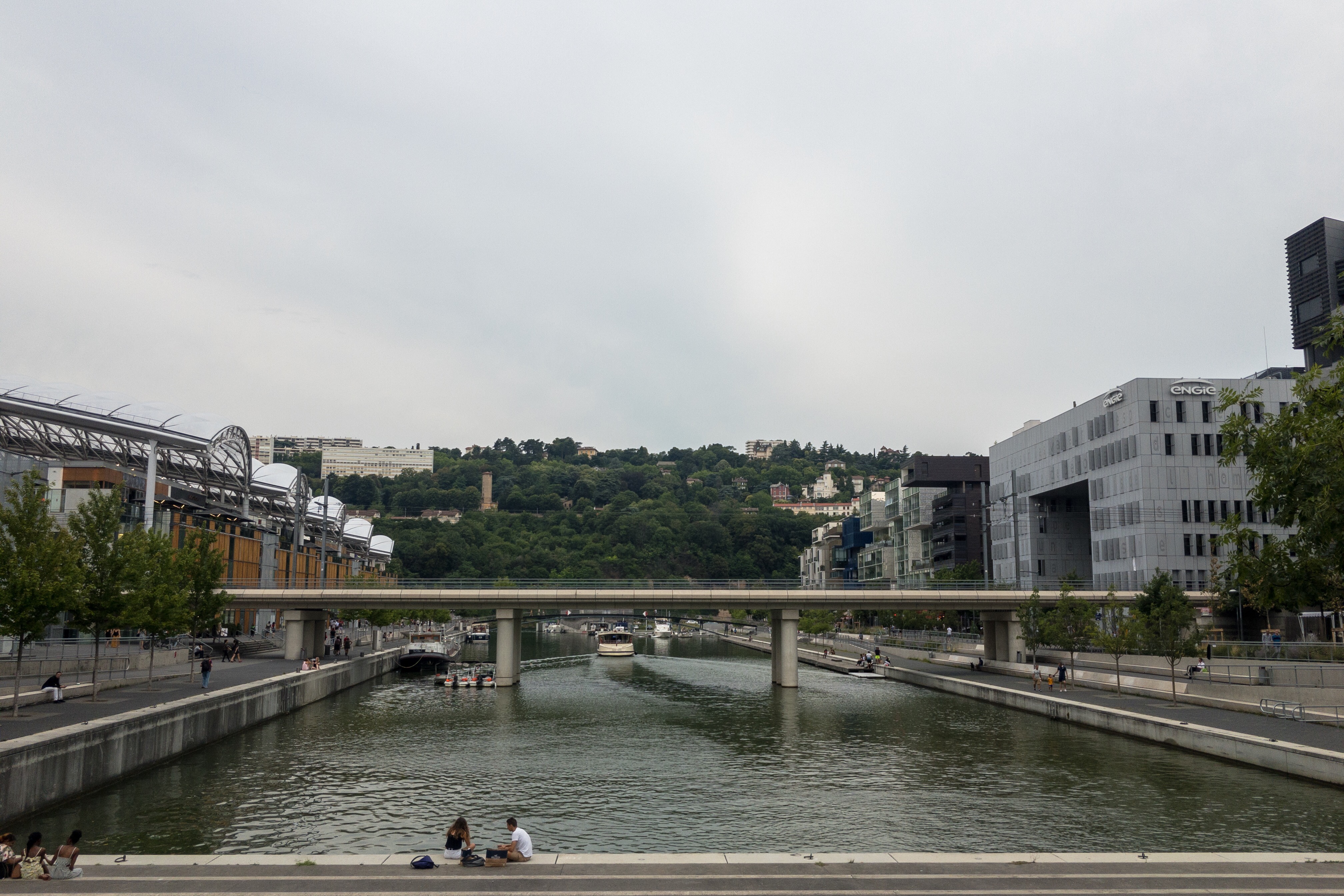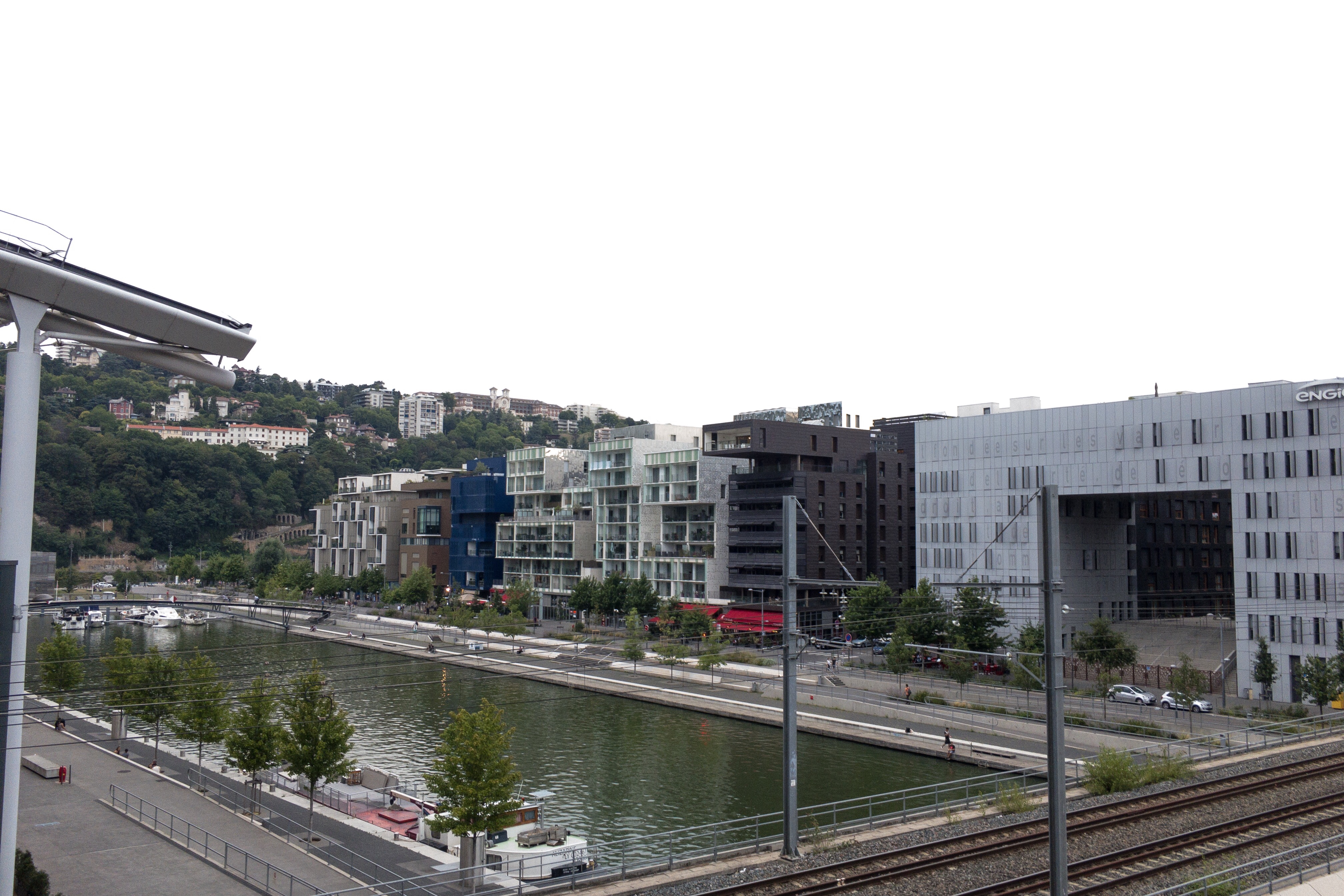 LYON– Continuing the story behind a visit to the relatively small town of Lyon, France demands that I scramble through a ton of fractured notes. In this instance, the deliberate horizons, leading lines and floating mirror intrigued me. Down the extended stairs, which also serve as benches is this wet mirror with a few boats drooling over ripples as they propel forward. Somehow, the border between this medium sized shopping/lifestyle complex and high density design precinct blurs very important lines. In a sense, the concrete blocks frame one’s line of sight. However, on foot the blocks fade and the tones, mountain-scape greens lean over to the front–sentimentally reflected in the mirror. These mountains keep older buildings which seem to host the cloud-like edges of the shopping precinct (left) and the modern cubist and mixed material faces (right). A strange juxtaposition that is very infatuating: past and future, vintage and modern, cubes and formlessness. The more time spent here, the more the concrete fades, the tarmac melts and every spot becomes and interesting (if not romantic) sitting. Without the need to shop, the location retains its historic and aesthetic value. Seeing the high-speed paint through this horizon line over the bridge is probably mind altering (if you’re like me). It maybe an engineering flair, but hiding the industrial and logistics sides that roam behind the curtains is what makes this place even more illusive. The lines, hidden, reflected or publicly placed carry with them a line of sight that just brings perspective. Very cubic, yet out of form.