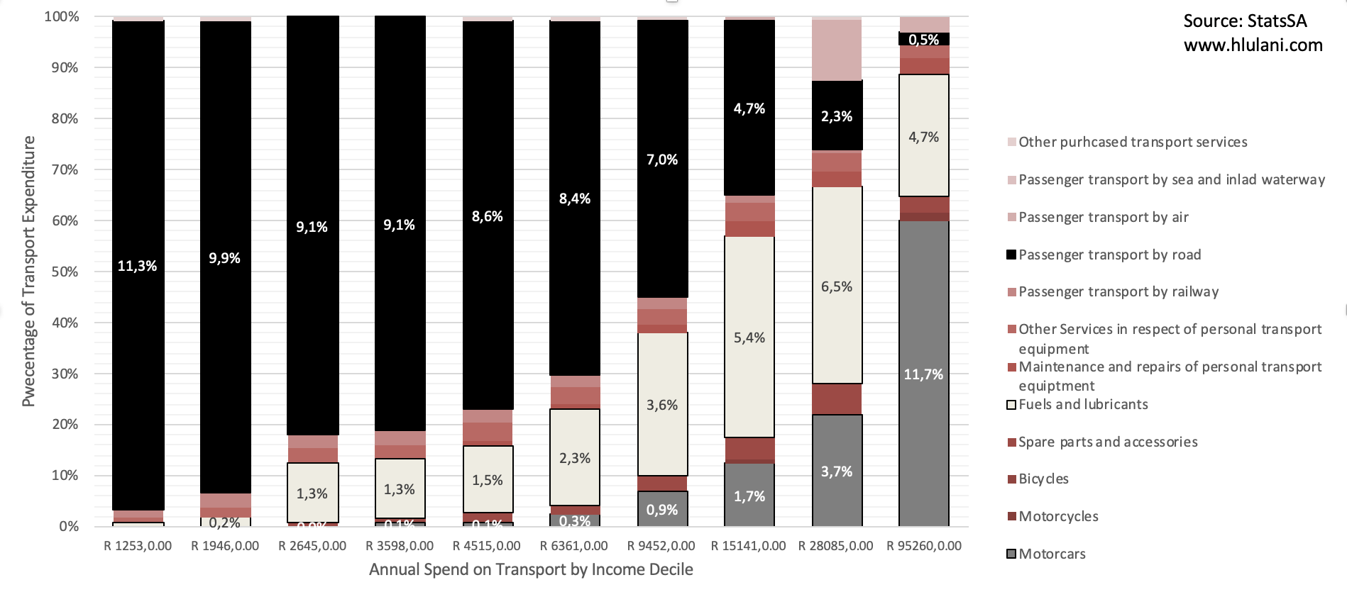 All these private vehicle expenditures are part and parcel of a tax economy which is used to fuel much of the public spending we see today. One of the biggest economic problems is that each income quintile must get the value of its buck— higher tax revenues from higher income households do not necessarily result in equivalent returns in terms of public expenditure. This is referred to as the cost of public funds. How much does your R1 of income tax and value added tax (VAT), fuel levy, carbon tax and other taxes do you get back?