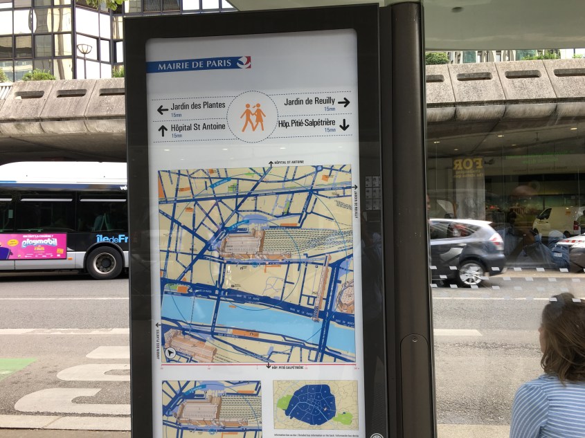 PARIS- There’s something about handing a map to each bus stop, or popular taxi stop, that makes finding one’s way a pleasure. In Paris, a 5 minute radius’ worth of activities and locations is attached to a bus stop. Moving it beyond just being for the bus, to serving those who parked on the otherside of town too.