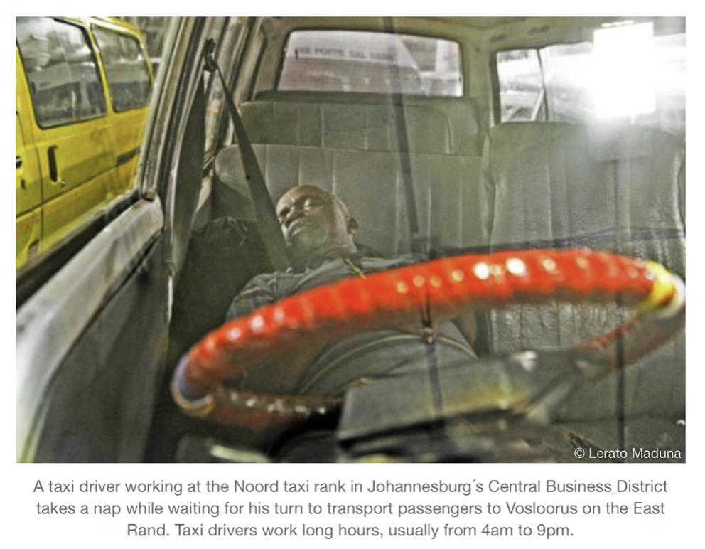 In 2013, another photographer, Lerato Maduna took to the photographic balance beyond a commuter’s eyes and peered into the minibus taxi driver’s world in Johannesburg. As part of a feature in the Goethe Institute’s online publication, she captures brief snippets of taxi driver’s livelihoods and attempts to lean into drop into their essence. Although, not as immersive and focused as Goldblatt’s approach, her work sets a different scene for mobility thought and practice. Highlighting the importance of not only worker’s rights, but raises the question of whether South African mobility and access interventions unearth a sense of dignity sought for in the private car. This dignity in anyways only existed for a brief period in the early stages of deregulating road transport in the 70’s.