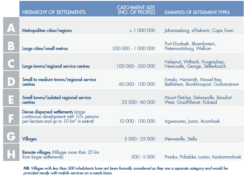 There is a stark contrast between the transport planning interventions in emerging cities, intermediary towns and rural areas. The Council for Scientific and Industrial Research (CSIR) published a report in 2012 aimed at guiding the transport and land-use fraternities to balance the relationship between “spatial accessibility” and “proximity” thresholds for public services. In other words, they provided guidelines for how many public service points should be available for a certain settlement class. This is a particularly constitutional issue, because if you have the ‘right’ to education and healthcare but you’re located far from these public services they may be difficult to reach (i.e. low proximity). Simultaneously, services may be located far from a specific neighbourhood but they are accessible through a certain transportation service which may either take people there or bring the service to the people.