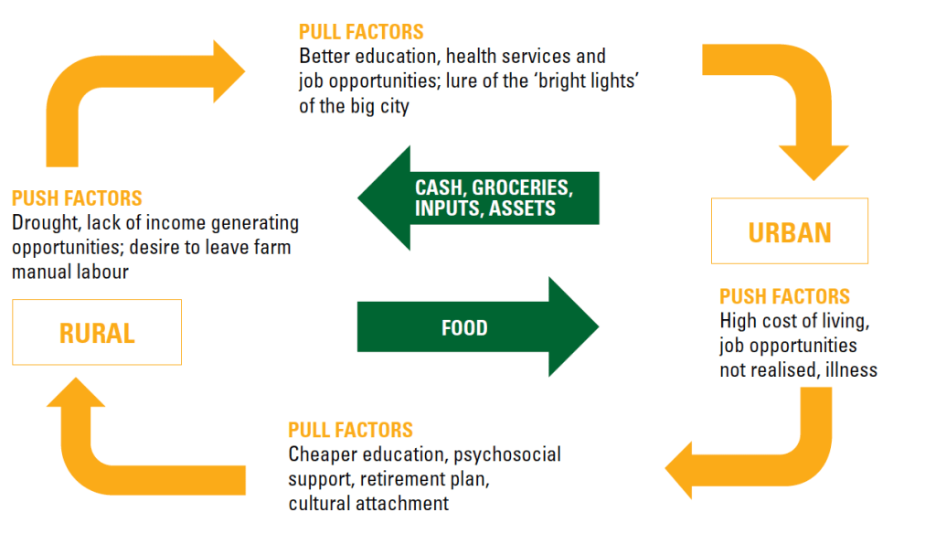 The framework operates along four strategic pillars, which go hand-in-glove: spatial integration, inclusion and access, growth and governance. Each one has significant implications for the mobility and access between and within the urban-rural dynamic. Particularly because the agglomeration effects of urban areas provide economies of scale and is composed of greater network effects due to the density of talent, labour and activity. However, the rural-urban push-pull factors outlined below from the IUDF highlight something quite important, but also miss a few things. Urban areas have an allure which tends to attract people from smaller towns toward these areas particularly in search of opportunities, realising aspirations or simply out of necessity because their current talent base does not fit the rural market.