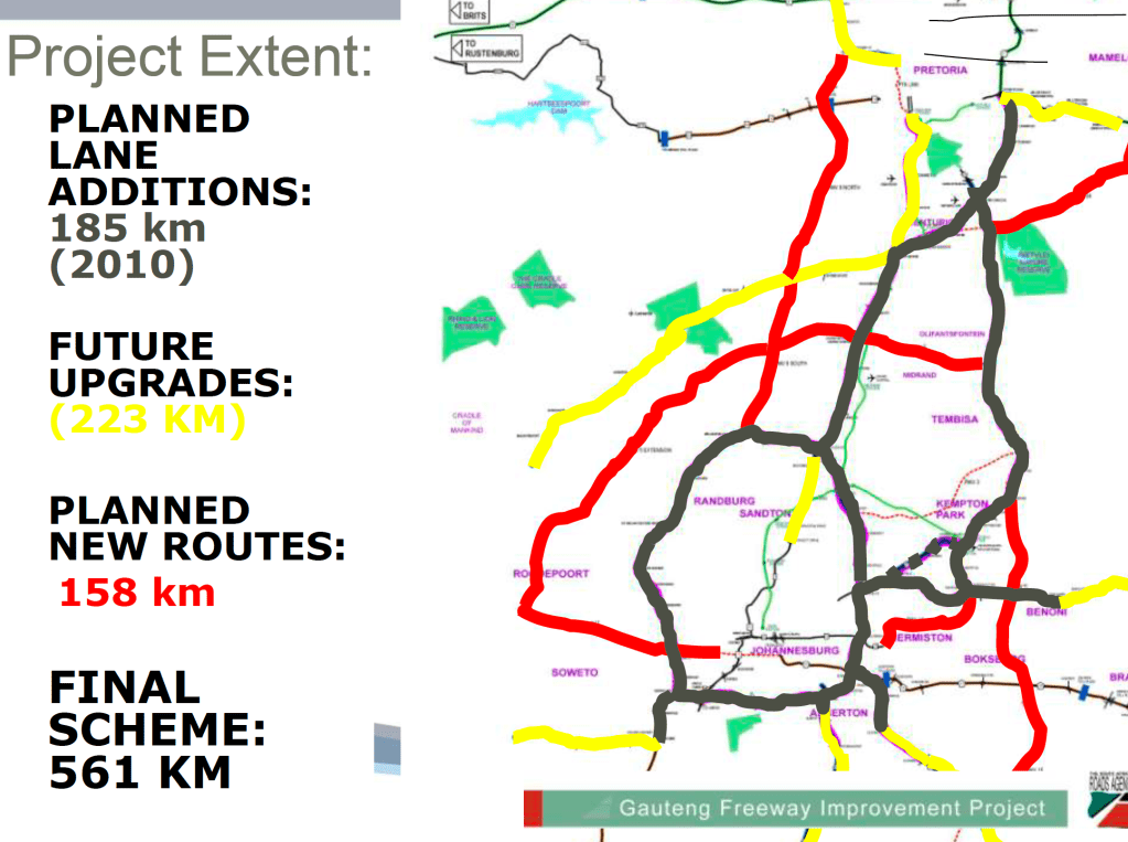 Of the 41 000km of roadways, the Gauteng Freeway Improvement Project (GFIP) aims to set a charge for 500km in total (560km to be exact)— only 1.2% in total. This small portion of roadway infrastructure aims to be a core source of funding for various interventions, after the debt has been paid. When the Gautrain Management Agency was formed it aimed to reduce the projected traffic congestion in Gauteng by offering public transport alternatives that could be car competitive in terms of time, level of service, price and safety/security. In the same vein, the GFIP aimed to manage the spatial development of Gauteng and contain future travel demand in an efficient and effective manner. The proposed improvements between the South African National Roads Agency (Pty) Ltd and the Provincial Government of Gauteng included:
