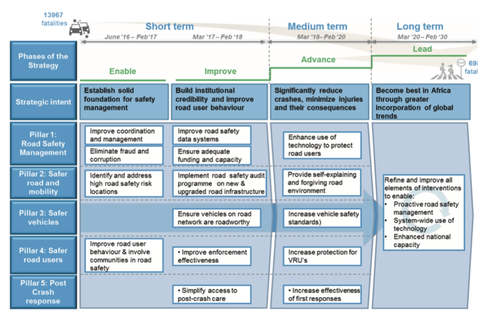 Moreso, the National Road Safety strategy is quite systematic, and its implementation is not only a Road Traffic Management issue: but it goes beyond this space. The strategy aims to reduce fatalities by 50% by 2030, below the 2010 base— that is a reduction of nearly 7000 fatalities. For 2020, the target is to reach about 10 000 fatalities through a reduction of at least more than 10%. The strategy depends on various actions— some quick to achieve, others much more complex and require significant intervention. Essentially, institutionalising the contract of trust among and between roadway users, institutions and authorities is important— especially through the introduction of new technologies which may serve as a key basis for intervention.