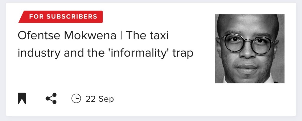 […] you for reading. This article is a follow-up of No. 228 titled: ‘The fabricated formalisation of the taxi industry‘, and was originally published on Fin24 on the 22 September […]