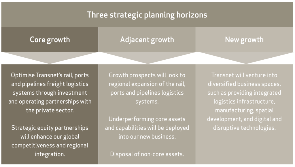 Focus on the “New Growth” bar: integrated logistics infrastructure; manufacturing; spatial development; and disruptive technology. Two of these offerings work and are already in line with Transnet Ltd. strategic direction: integrated logistics infrastructure and spatial development. Manufacturing is a different dimension of the business and it should be treated separately entirely.