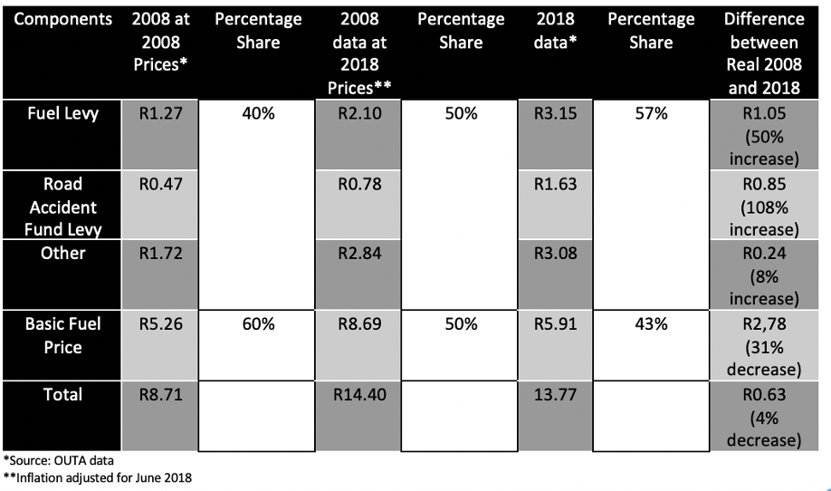 With regard to OUTA’s report we need to be weary of is unadjusted financial data presented in a manner that appeals to a group sentiment, rather than accurately and objectively explores what the data and evidence means. To draw the conclusion that the fuel price is “all taxes and very little paid for the actual commodity” is appealing but erroneous.