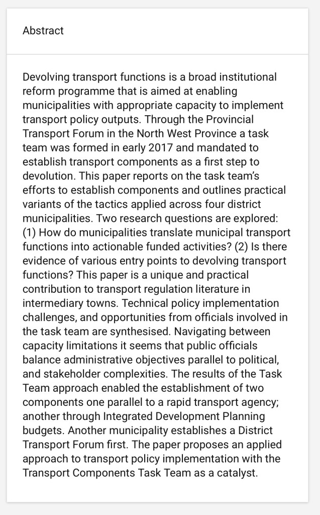 Surely there’s some evidence of progress, but in our recent paper the focus is on showing how we created the task team’s underlying principles. The paper can be requested on ResearchGate but it is due for presentation at the Southern African Transport Conference during the 5-7 July.